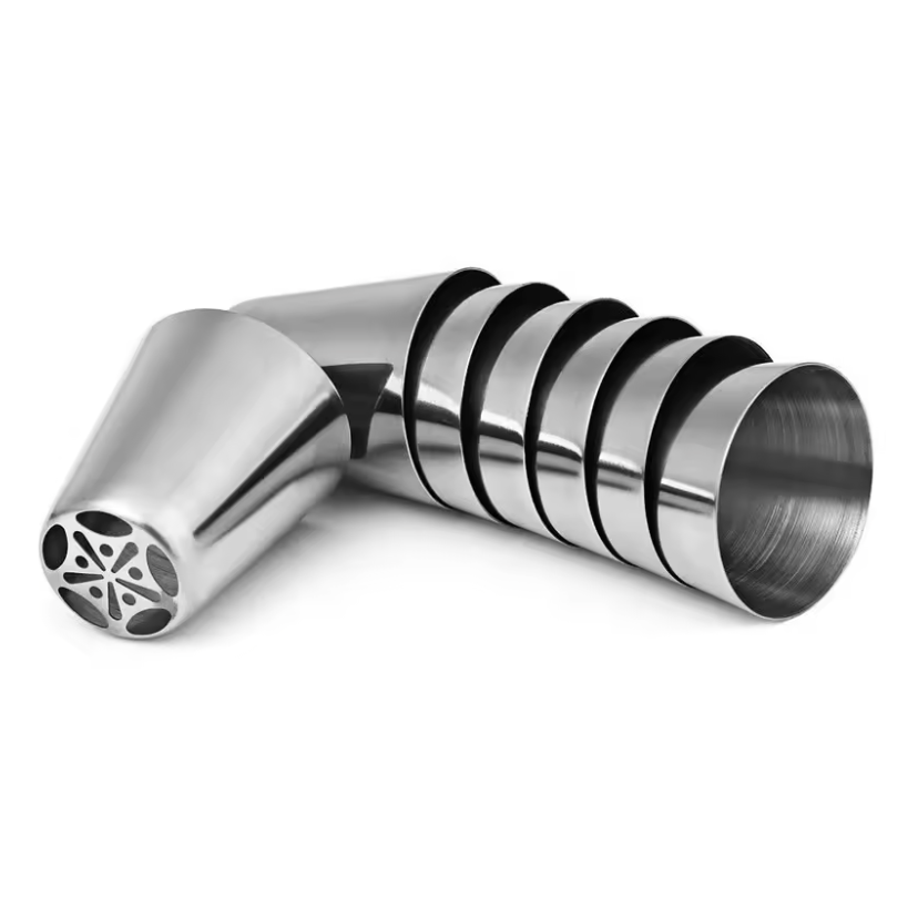 Chaque kit contient exactement 12 embouts en acier inoxydable de formes variés ainsi qu'un adaptateur triple et une poche à douille réutilisable.