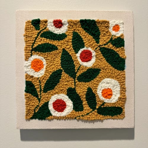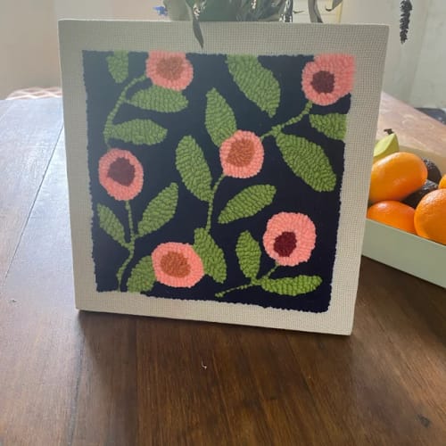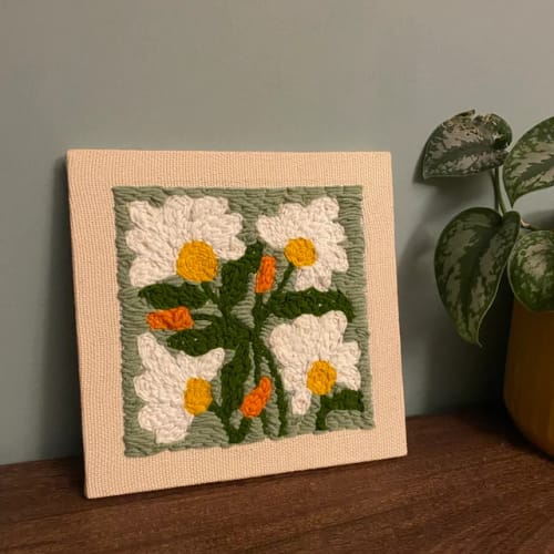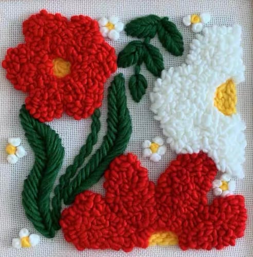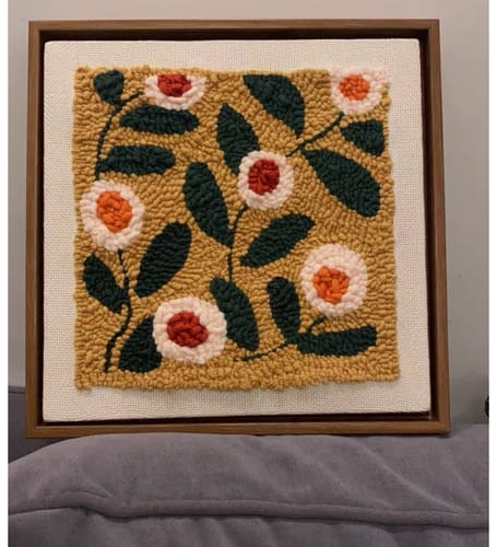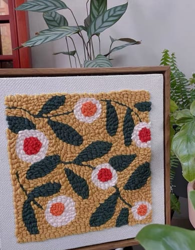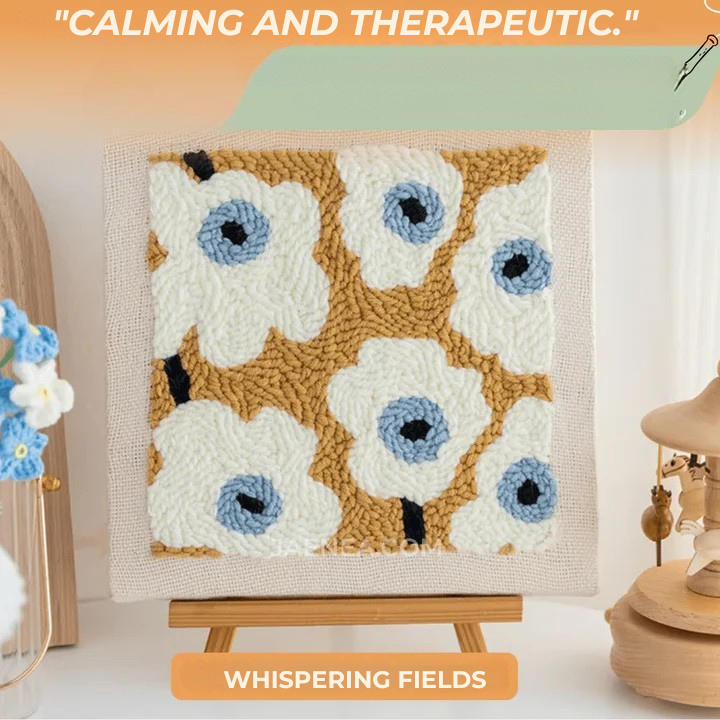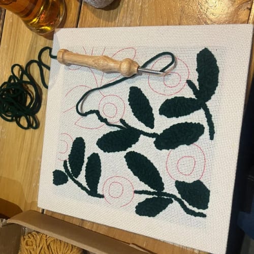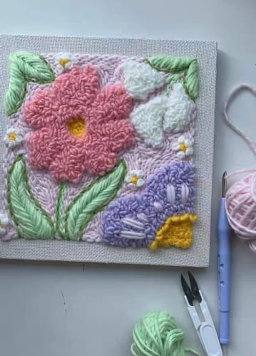 The kit includes an embroidery canvas, a punch needle, and skeins of embroidery wool.